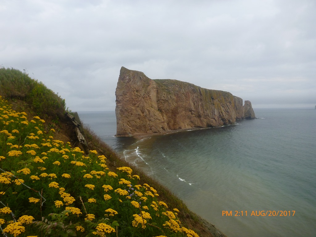 Coming from the town of Gaspe getting our first glimpse of Perce Rock.